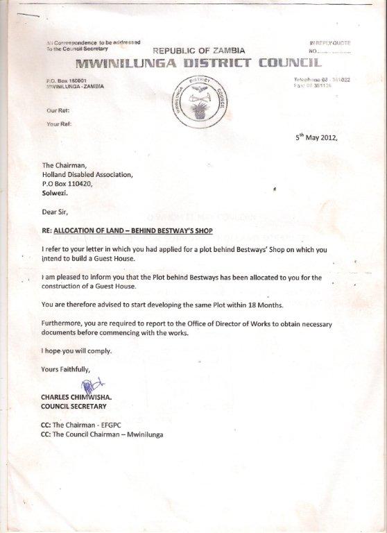 Hun doel is zoveel mogelijk mensen met een handicap aan een baan en dus een goede toekomst te helpen. En dat niet alleen in Solwezi. In het 280 km verderop gelegen Mwinilunga is via de gemeente een stuk grond gekocht, in het centrum van het dorp. Ook daar wil het bestuur van HDA een aantal winkeltjes bouwen en een klein hotel, een guesthouse. De winst van het guesthouse moet ook daar straks voldoende zijn om NOG meer gehandicapten te helpen, en in het bijzonder in het verre Noordwesten van Zambia!