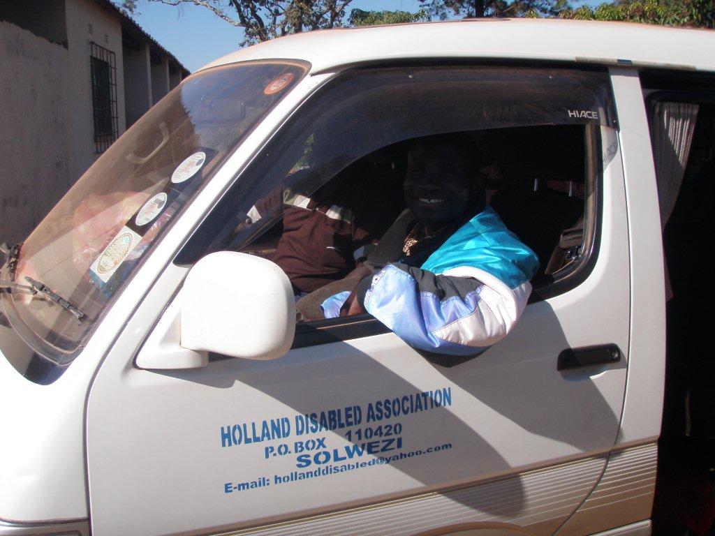 Association” (HDA) en hij ziet het met eigen ogen gebeuren. In het verleden is er met Stichting “Op Eigen Benen” Zambia een guesthouse en een tiental winkeltjes gebouwd en die ter beschikking van de gehandicapten gesteld. Zij hebben er een winstgevende onderneming van gemaakt, hebben vijftien gehandicapten in dienst, die dus allemaal een inkomen verdienen, nog eens zeventig leden die ook ondersteund worden bij medische hulp etc…. en nu hebben ze als klap op de vuurpijl een eigen auto gekocht. Een heuse personenbus! Nu zijn ze niet meer afhankelijk van openbaar vervoer of de goede zin van medeburgers en kunnen ze zelf beslissen wanneer ze klienten bezoeken, medeleden naar een ziekenhuis brengen, een project bezoeken etc…. En dat alles in het teken van “Empowering Persons with Disabilities”.